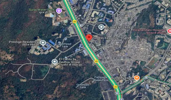 Located opposite Suraj Water Park on Ghodbunder Service Road, Godrej Exquisite enjoys a prime position in Vijay Nagari, Thane West, within a rapidly expanding residential neighborhood. Thane Railway Station is roughly 11 km away, while Mumbai International Airport can be reached within approximately 27.9 km. The upcoming Navi Mumbai International Airport, located approximately 32.7 km away, adds strength to the project’s long-term connectivity value. The proposed Kasarvadavali Metro Station on Line 4, expected to be functional from 2025, will further improve daily travel options. Lifestyle and retail destinations such as Hypercity, D-Mart, Big Mall, and Next Mega Mall are easily accessible.